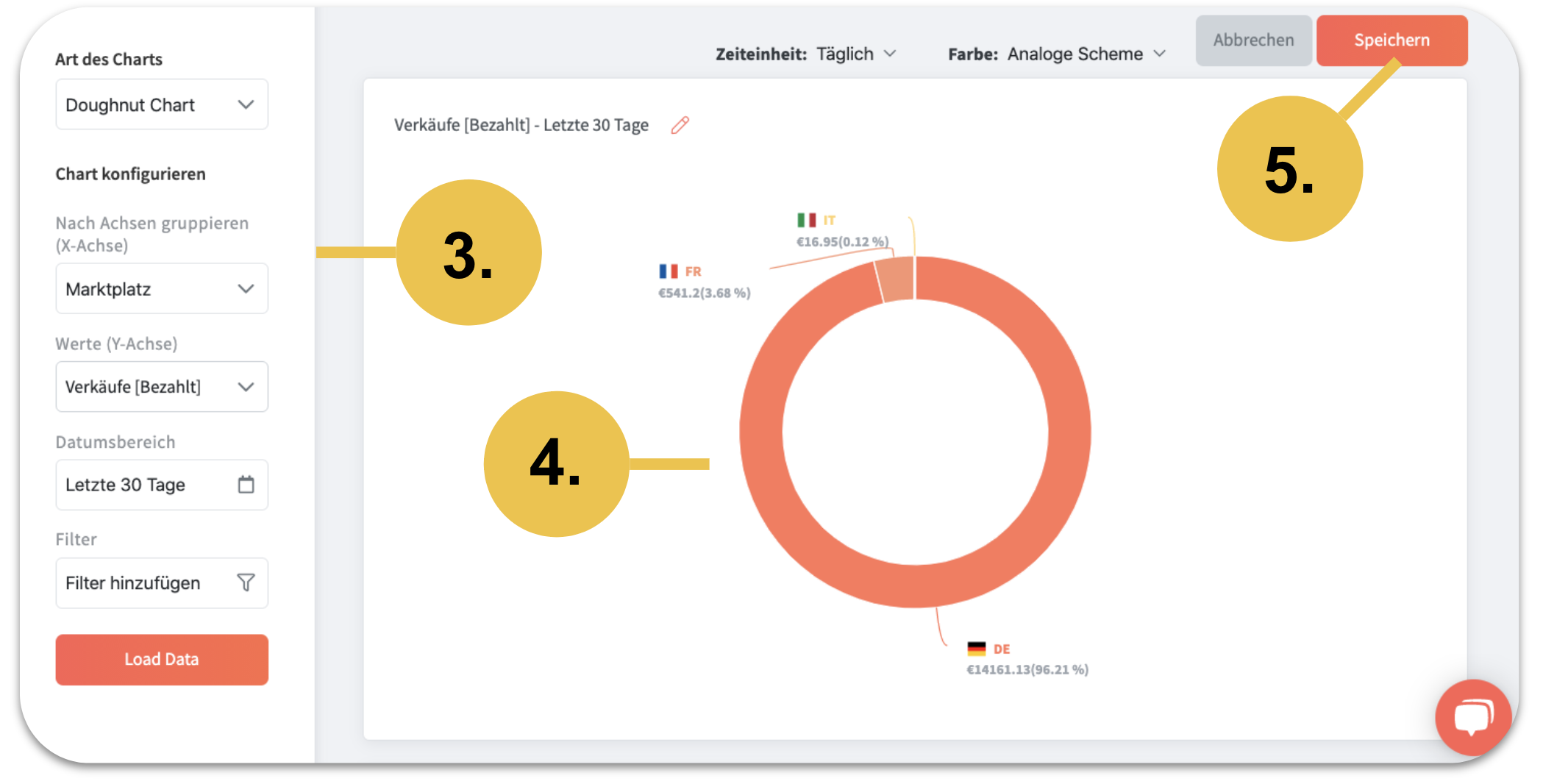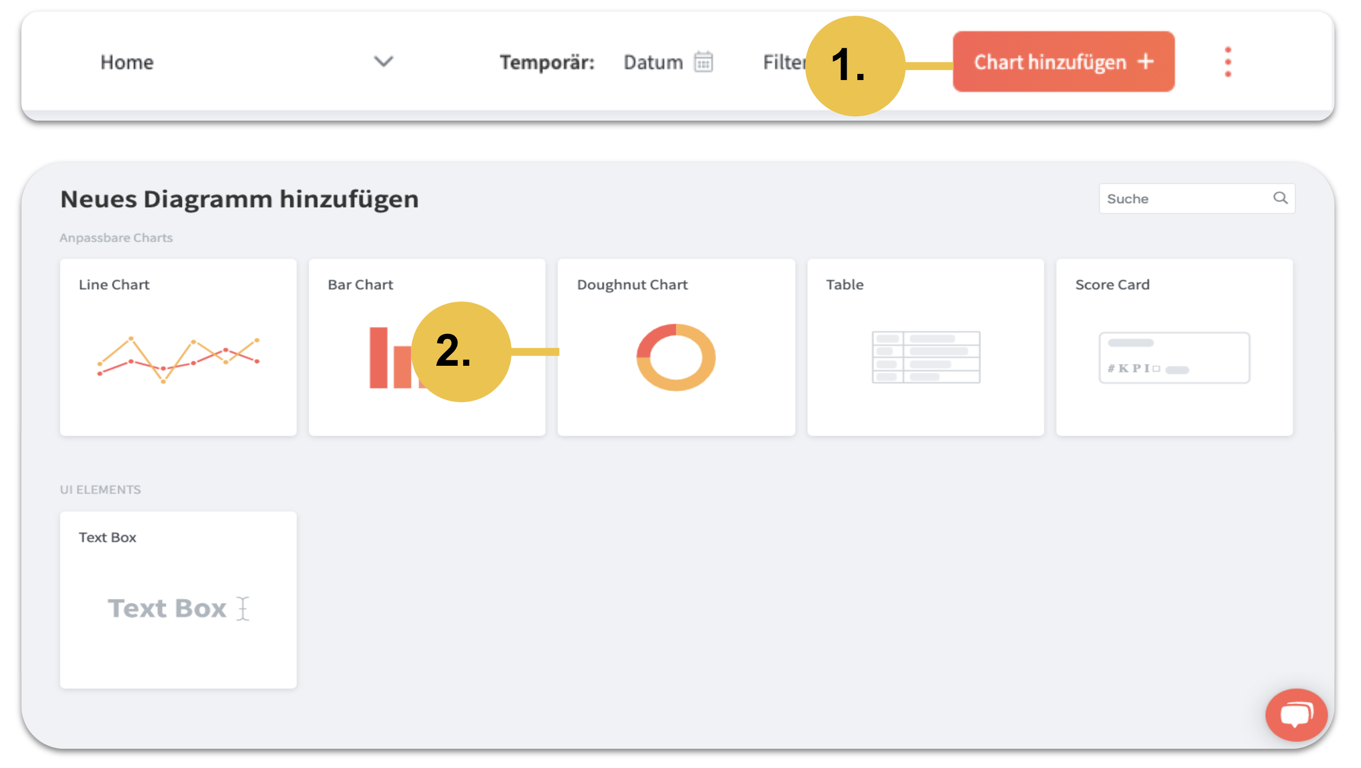 Nur mit wenigen Klicks können Sie Ihr bereits bestehende Dashboard um weitere Charts oder Tabellen erweitern. Klicken Sie bitte in Ihrem Dashboard oben rechts auf "Charts hinzufügen". Wählen Sie zunächst die Art des Charts aus und konfigurieren Sie Ihre Kennzahl genau nach Ihren Bedürfnissen.