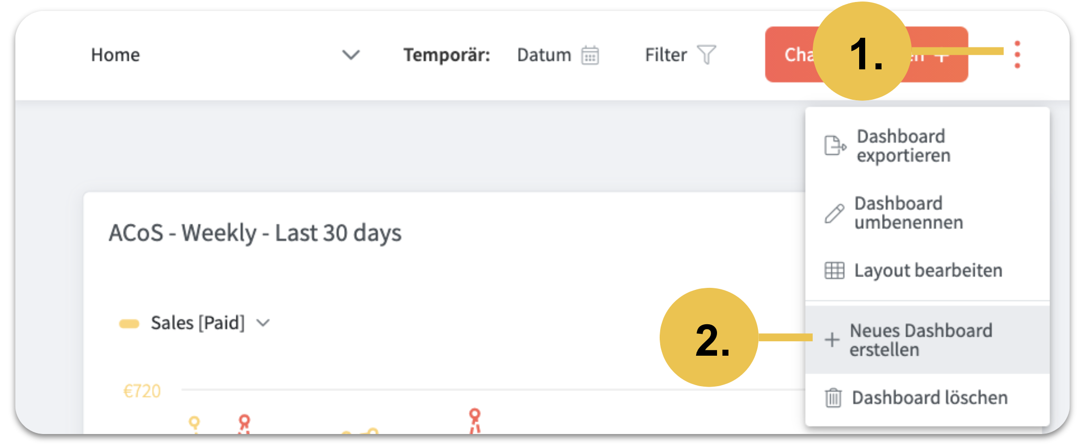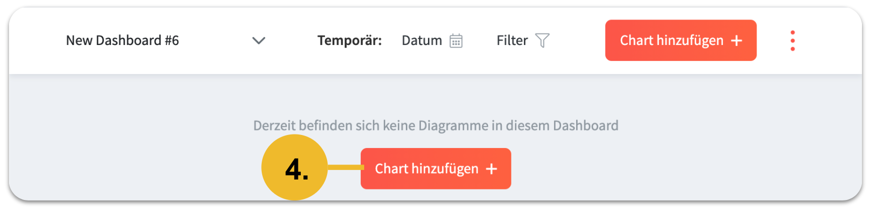 Sie möchten ein individuelles Dashboard komplett mit Ihren Charts und Tabellen erstellen? Kein Problem! Die Erstellung eines Dashboard kostet Sie ebenso nur wenige Klicks. Bitte oben rechts auf das Dropdown Menü klicken, um ein neues Dashboard zu erstellen.
