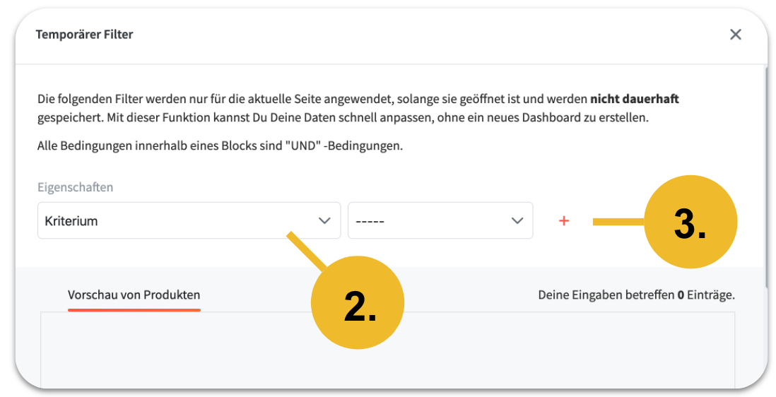 Neben dem Zeitraumfilter haben Sie die Möglichkeit weitere Filter zusetzen. Dazu bitte auf "Filter" klicken und Ihre persönliche Kriterien eingeben. Außerdem können Sie nach mehreren unterschiedlichen Kriterien filtern. Dazu nur das "+"-Zeichen anklicken und weiteres Kriterium auswählen.