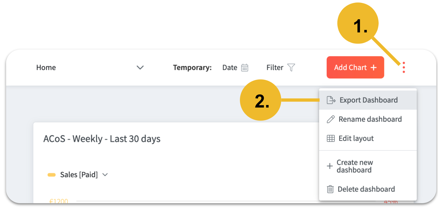 To export a dashboard, click "Export Dashboard" in the top right menu.